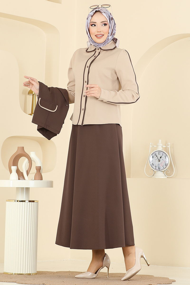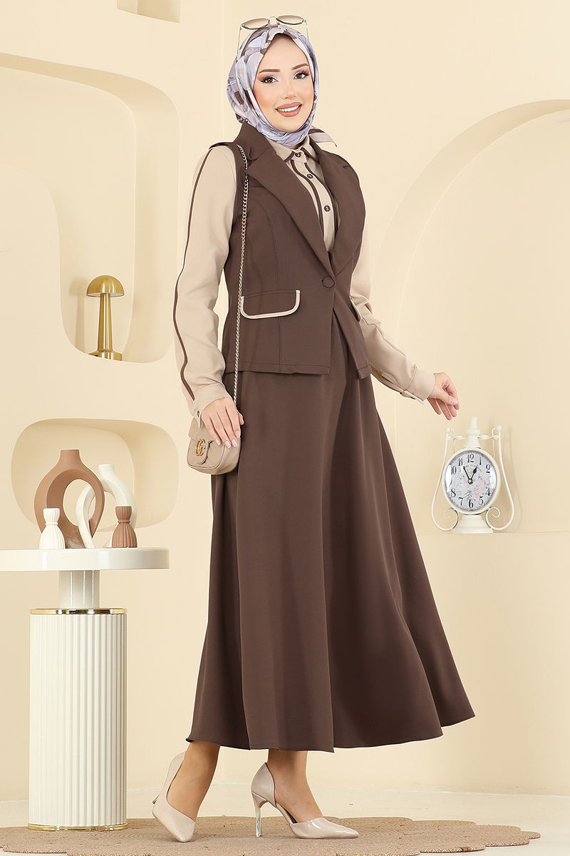 Yelekli Şık Üçlü Takım Kahve