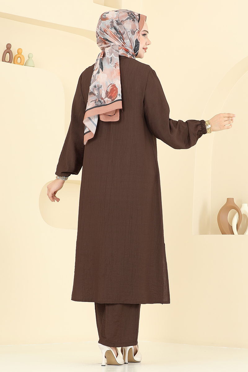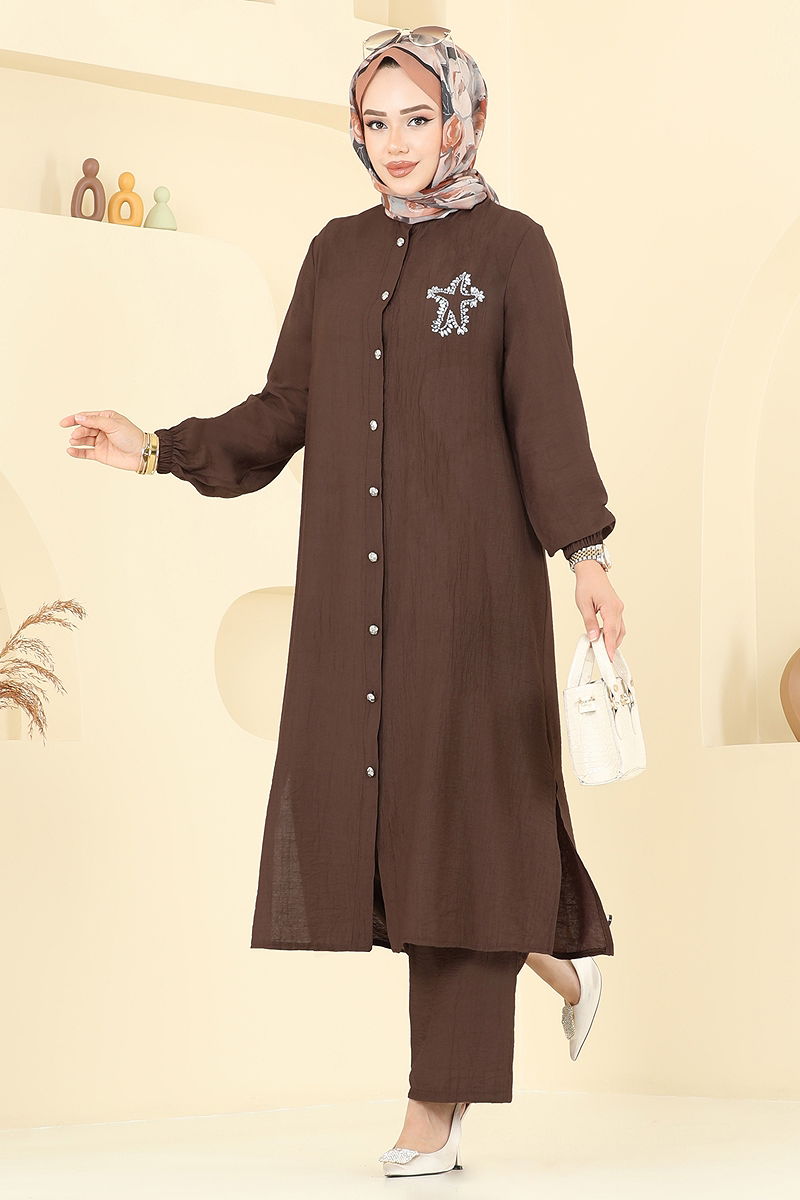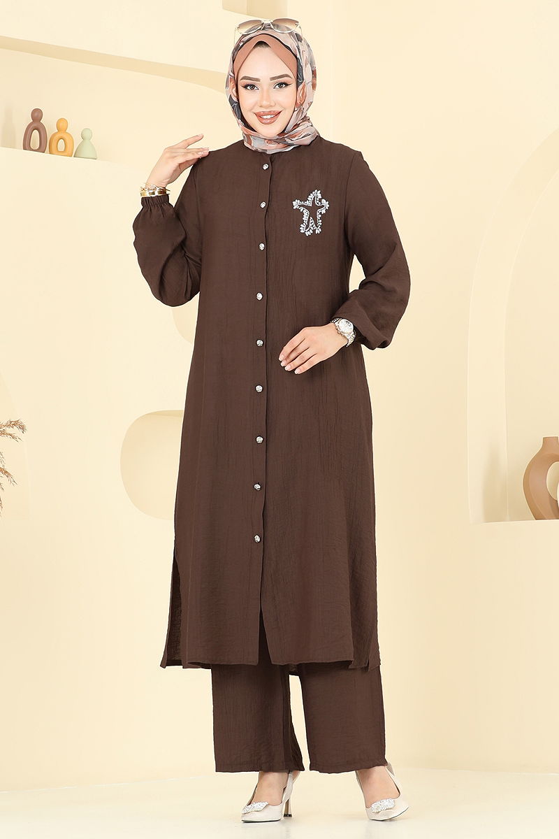 Yıldız Detaylı Tesettür Takım, dört mevsim rahatlıkla kullanılabilen bir kombin modelidir. 30 derecede hassas yıkama programıyla yıkanabilir özelliği bulunan bu ürün, krinkıl (ağaç kabuğu) ve tensel kumaştan üretilmiştir. Yarım hakim yaka ve önden düğmeli tasarımı ile şık bir görünüm sunar. Tunik yan yırtmaçlı olup, astarsızdır. Taş detayları yapıştırma ile pantolonun beli lastikli ve manşetler elastiktir. Hem şık hem de rahat bir seçim arayanlar için ideal.