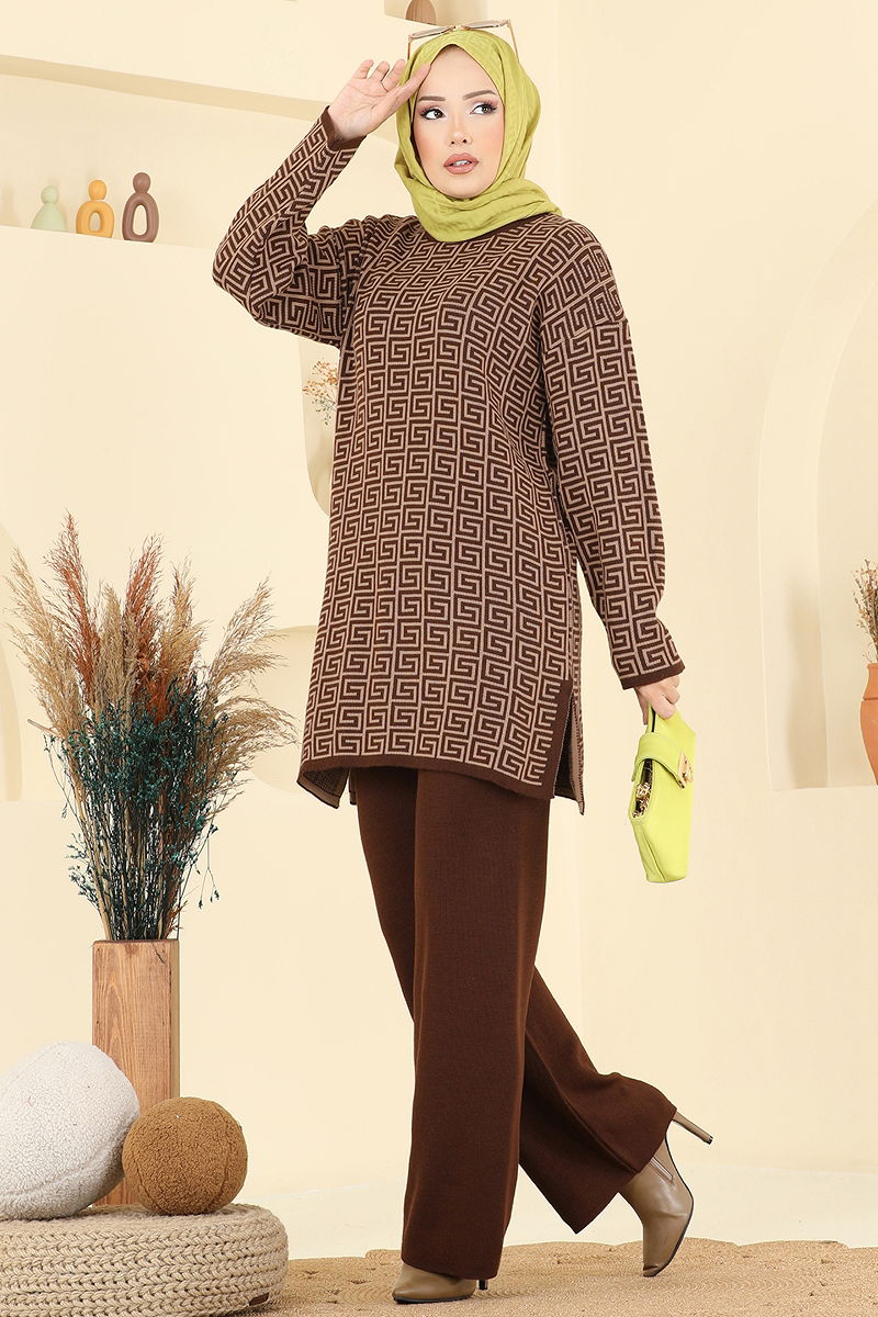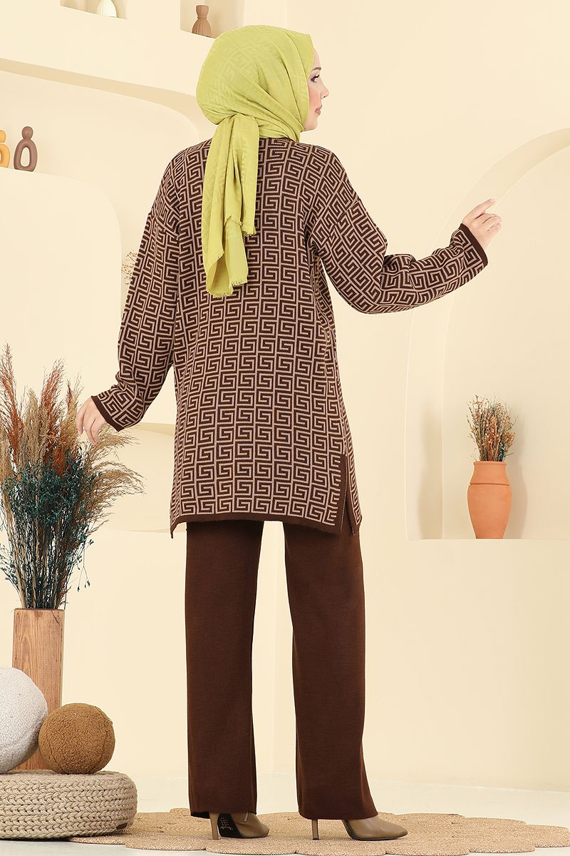 Yırtmaç Detaylı Desenli Takım 2718AYD574 Kahve