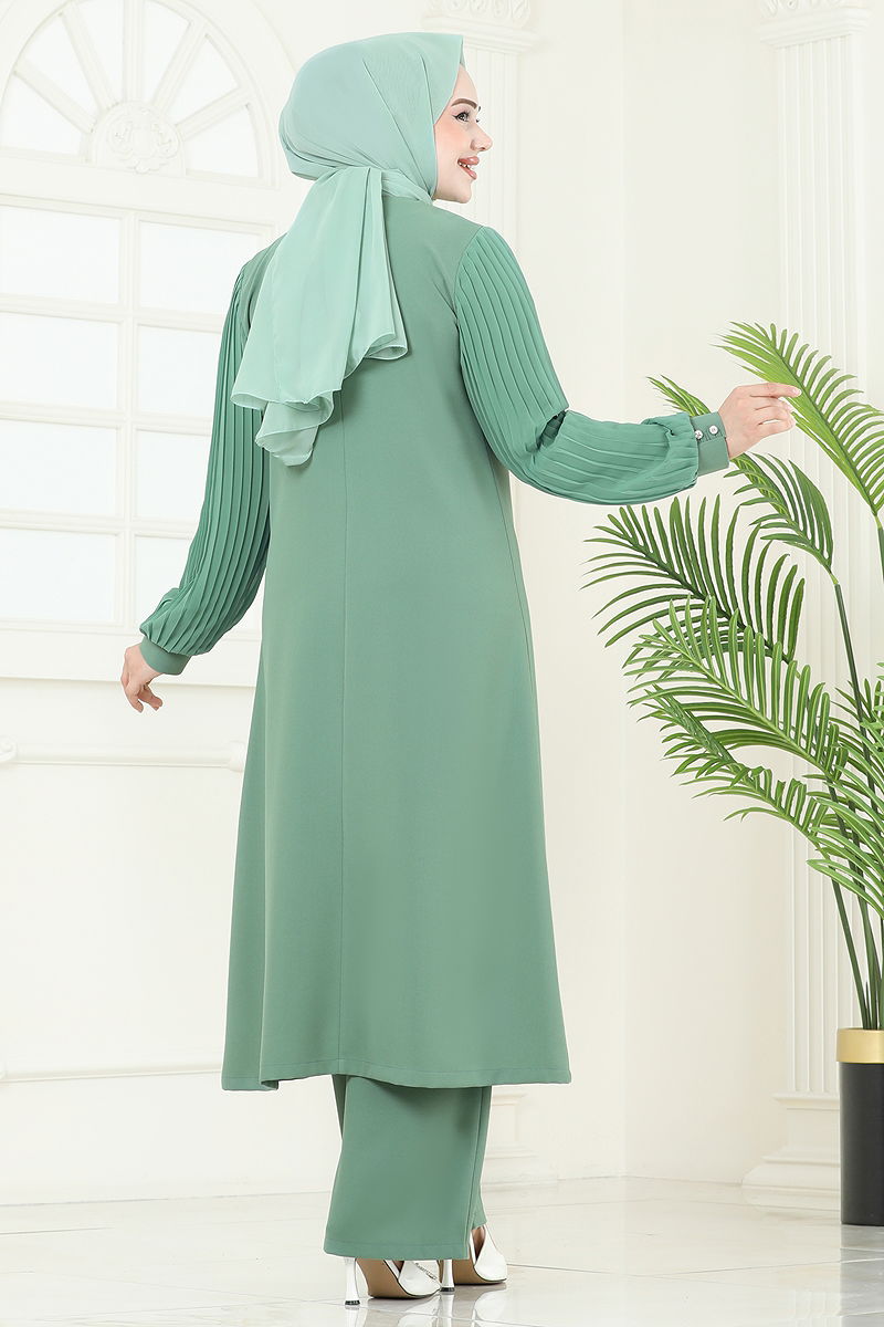 Ürün Özelliği : Yeni sezon tesettür moda ürünüdür. Ürün Bisiklet yakadır. Tunik yandan yırtmaçlıdır.. Astarsızdır. Ürün Sırttan fermuarlıdır. Boncuk detayları çakımdır. Taşlar yapıştırmadır. Pantolon beli lastiklidir. Manşet düğmeleri aktiftir. Konsept fotoğraf çekimlerinden dolayı üründe ton farklılığı olabilir.