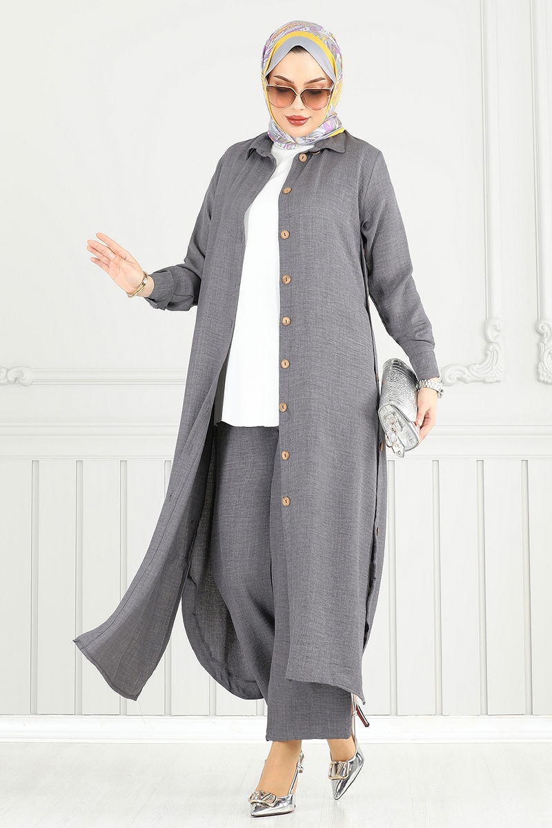 Yırtmaç Düğmeli Keten Takım, modern ve şık bir tesettür kombinidir. Sofia Keten kumaşı ile dört mevsim rahatlık sağlar. Hassas yıkamaya uygun olan bu set hem şıklığı hem de konforu bir arada sunar. Gömlek yakalı tunik ve elastik bel pantolondan oluşur. Önden düğmeli ve manşet düğmeleri aktiftir. Her türlü ortama uyum sağlayan bu takım, dolabınızın vazgeçilmez parçalarından biri olacak.