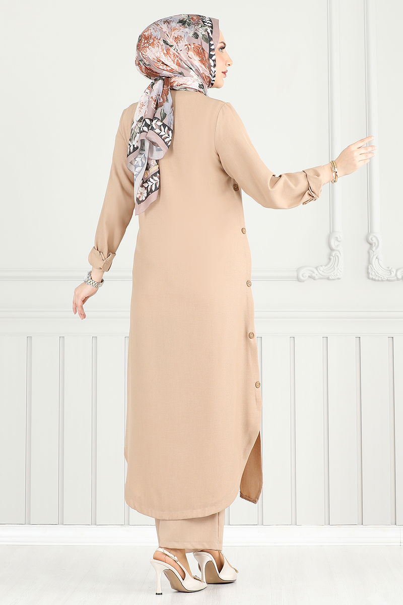 The Slit Buttoned Linen Suit is a modern and stylish modest wear combination. Made of Sofia Linen, it offers comfort throughout all seasons. Suitable for delicate washing, this set combines elegance with comfort. It includes a shirt-collared tunic and elastic-waisted pants. Front buttons and sleeve cuff buttons are functional. This versatile suit will become an essential part of your wardrobe for any occasion.