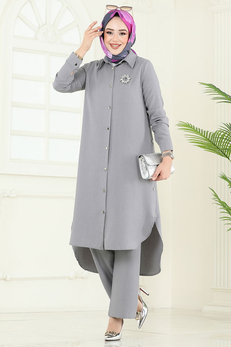 Yırtmaç Düğmeli Tesettür Kombin Gri