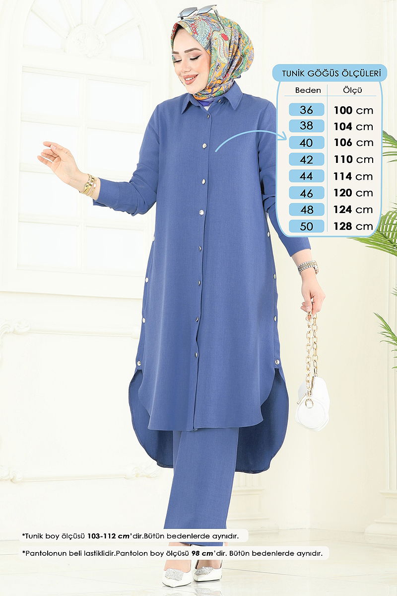 Yırtmaç Düğmeli Tesettür Kombin İndigo