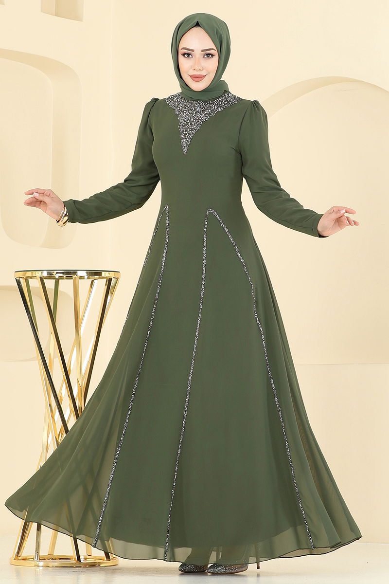 Yırtmaç Görünümlü Taşlı Şifon Abiye 8106AB368 Haki