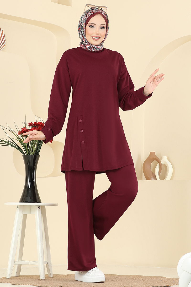 Yırtmacı Aksesuar Düğmeli Takım kombin modelimiz, dört mevsim boyunca rahatlıkla kullanabileceğiniz şık bir tesettür ürünüdür. İki iplik kumaş ile üretilen bu takım, bisiklet yakalı tuniği ve elastik bel pantolonu ile konfor ve şıklığı bir arada sunar. Ön yırtmaç detayı ve manşetlerdeki aksesuar düğmeleri ile tasarımı tamamlanmıştır. Hassas yıkama modunda 30 derecede yıkanabilir. Modelin üzerindeki ürün 38 bedendir ve sırttan kullanılabilir düğmeye sahiptir.