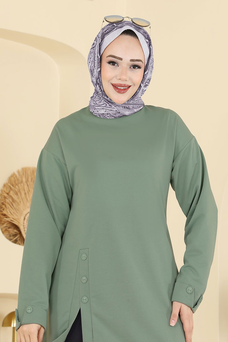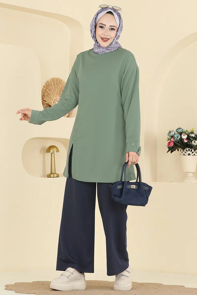 Yırtmacı Aksesuar Düğmeli Takım kombin modelimiz, dört mevsim boyunca rahatlıkla kullanabileceğiniz şık bir tesettür ürünüdür. İki iplik kumaş ile üretilen bu takım, bisiklet yakalı tuniği ve elastik bel pantolonu ile konfor ve şıklığı bir arada sunar. Ön yırtmaç detayı ve manşetlerdeki aksesuar düğmeleri ile tasarımı tamamlanmıştır. Hassas yıkama modunda 30 derecede yıkanabilir. Modelin üzerindeki ürün 38 bedendir ve sırttan kullanılabilir düğmeye sahiptir.