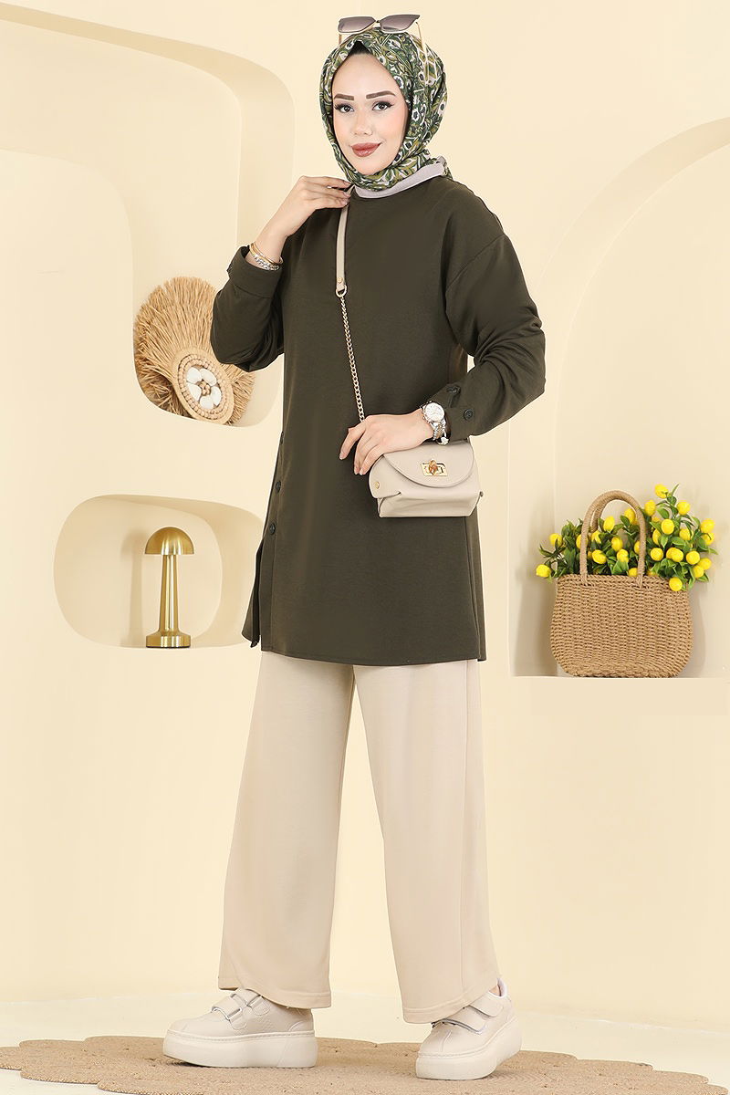Yırtmacı Aksesuar Düğmeli Takım kombin modelimiz, dört mevsim boyunca rahatlıkla kullanabileceğiniz şık bir tesettür ürünüdür. İki iplik kumaş ile üretilen bu takım, bisiklet yakalı tuniği ve elastik bel pantolonu ile konfor ve şıklığı bir arada sunar. Ön yırtmaç detayı ve manşetlerdeki aksesuar düğmeleri ile tasarımı tamamlanmıştır. Hassas yıkama modunda 30 derecede yıkanabilir. Modelin üzerindeki ürün 38 bedendir ve sırttan kullanılabilir düğmeye sahiptir.