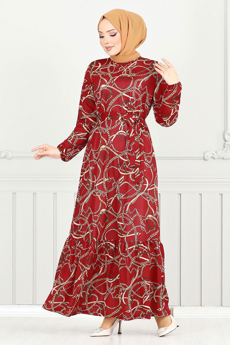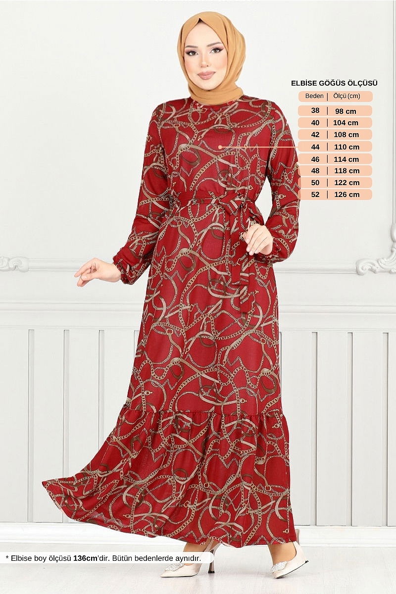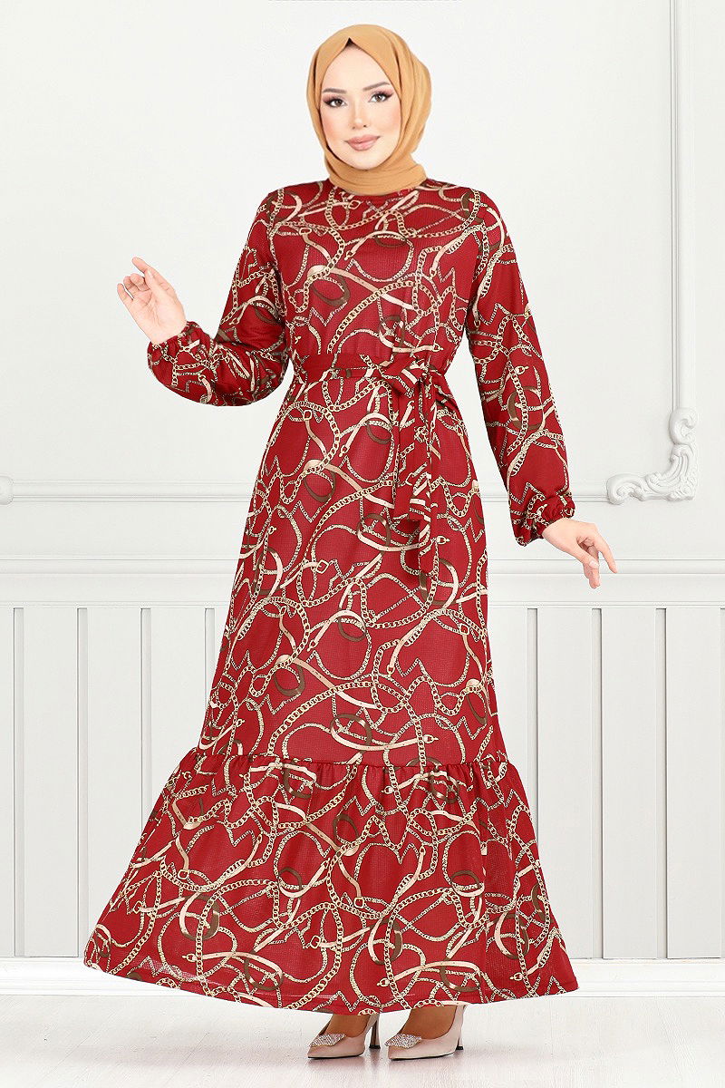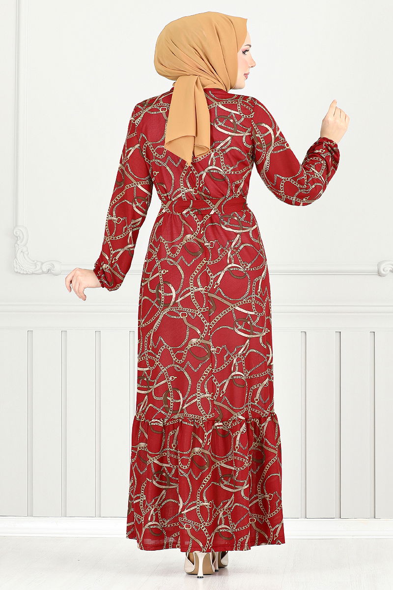 Zincir Desenli Elbise Kırmızı