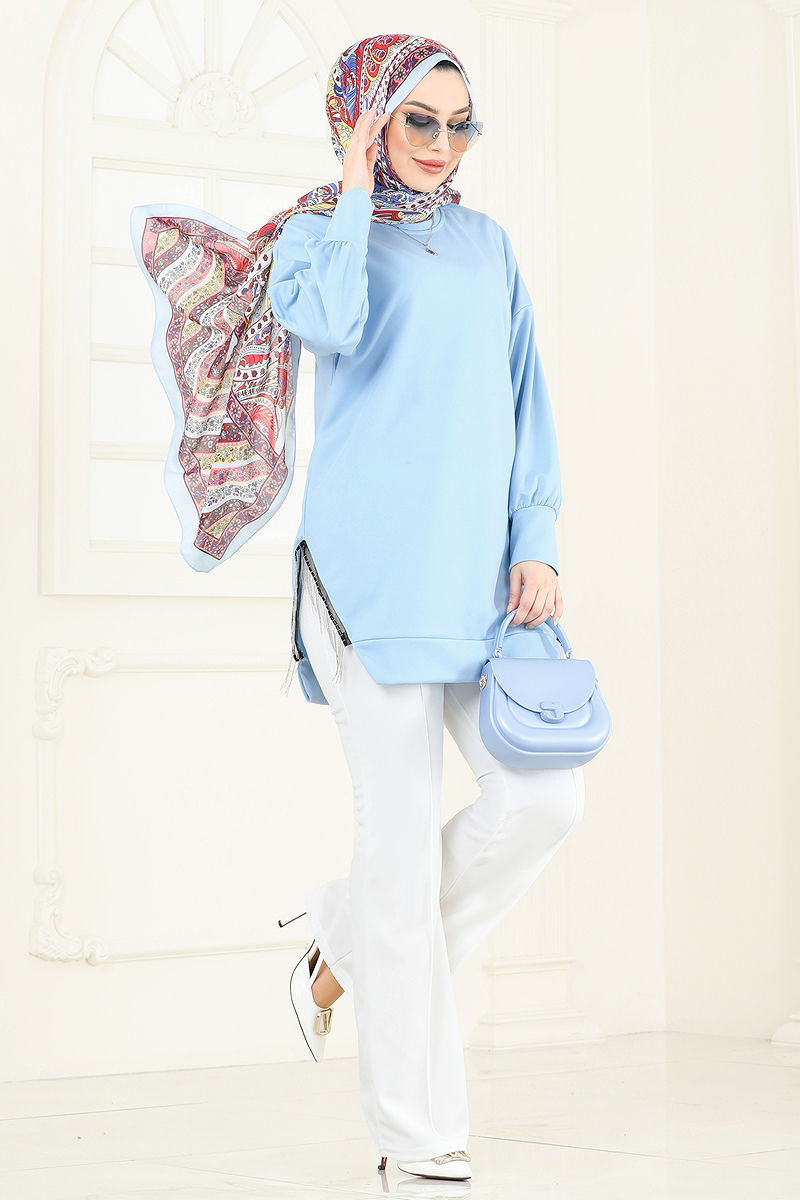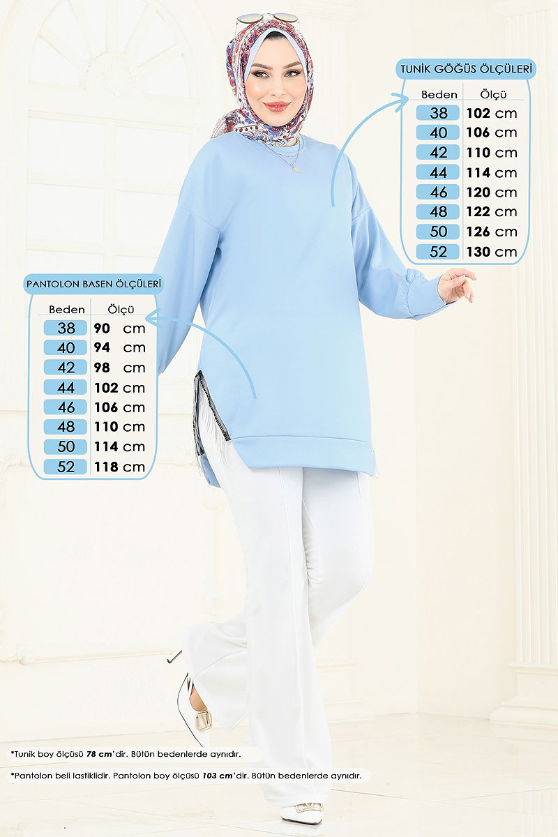 Ürün Özelliği : Yeni sezon tesettür moda ürünüdür. Ürün Bisiklet yakadır. Tunik yandan yırtmaçlıdır.. Astarsızdır. Zincir ürüne dikilidir. Aksesuarlar ürüne dahil değildir. Pantolon beli lastiklidir.Pantolon ispanyol paçadır. Konsept fotoğraf çekimlerinden dolayı üründe ton farklılığı olabilir.