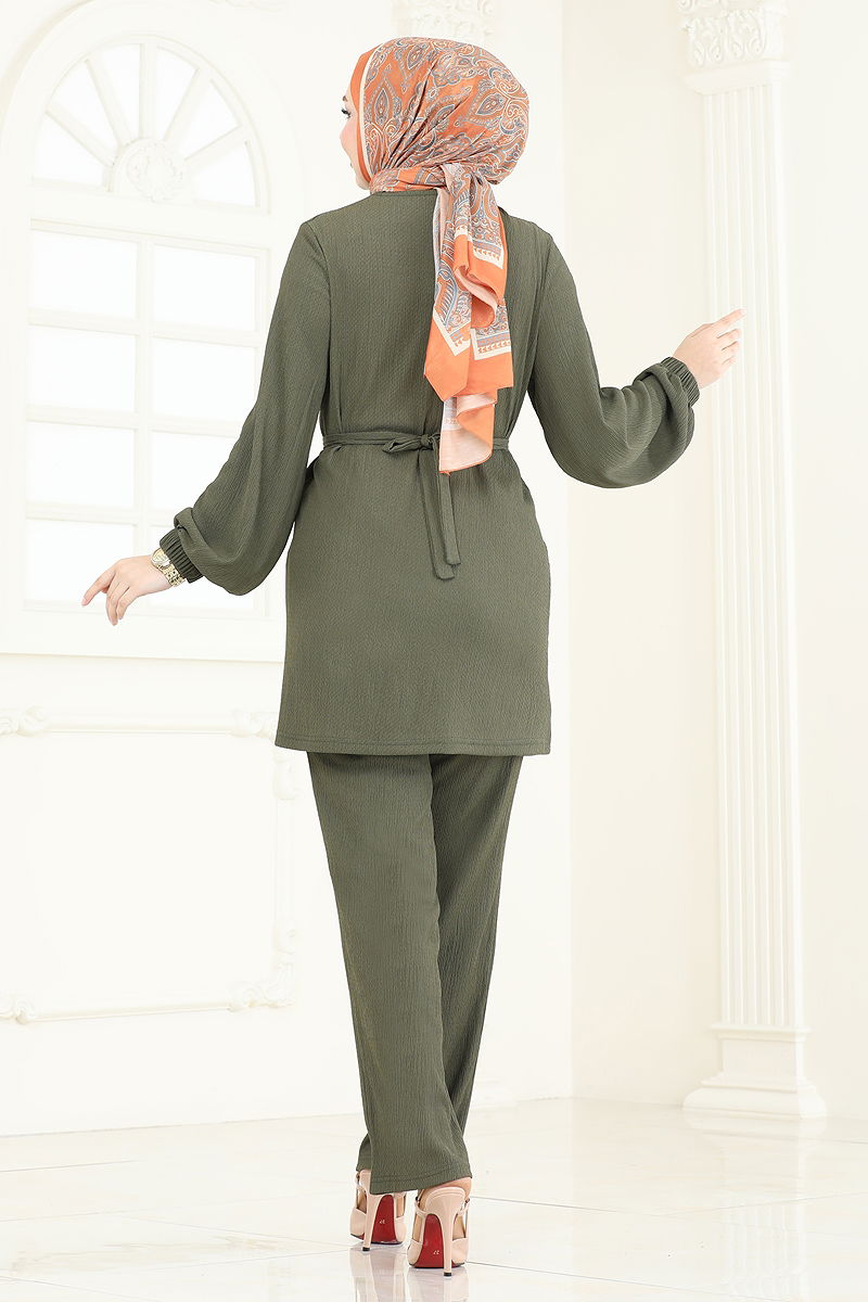 Zincir Kemerli Tesettür Takım Haki