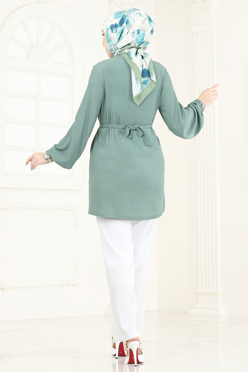 Zincir Kemerli Tesettür Takım Mint&Ekru