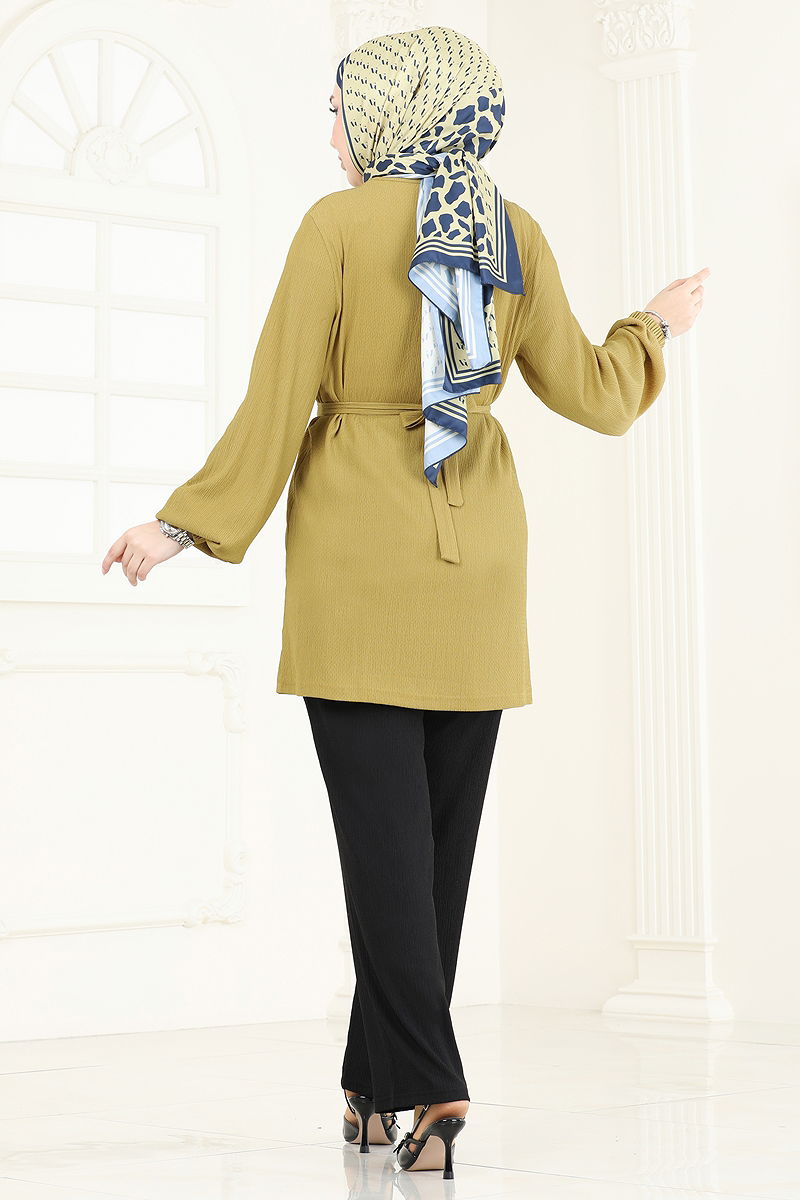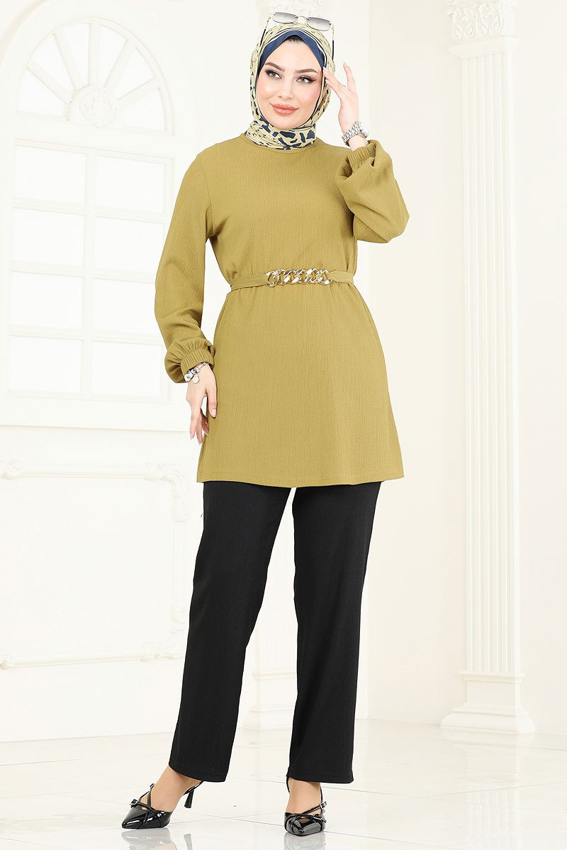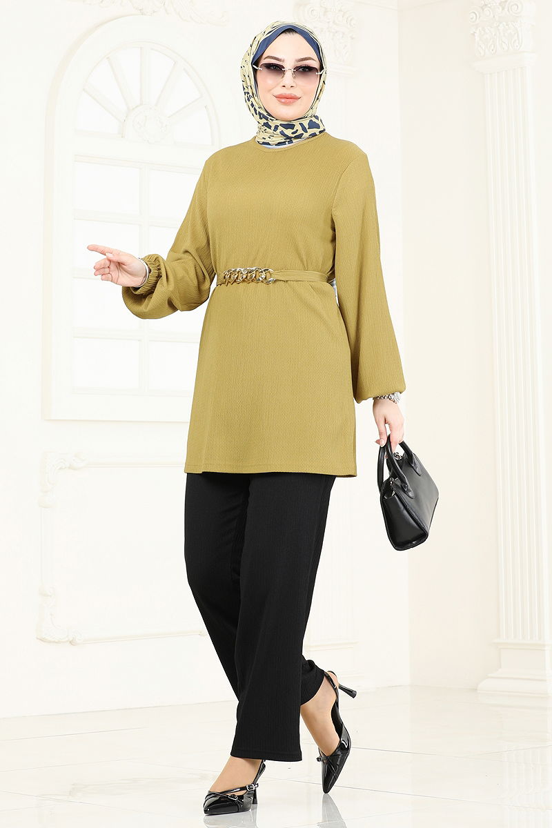 Zincir Kemerli Tesettür Takım Yağ Yeşili&Siyah